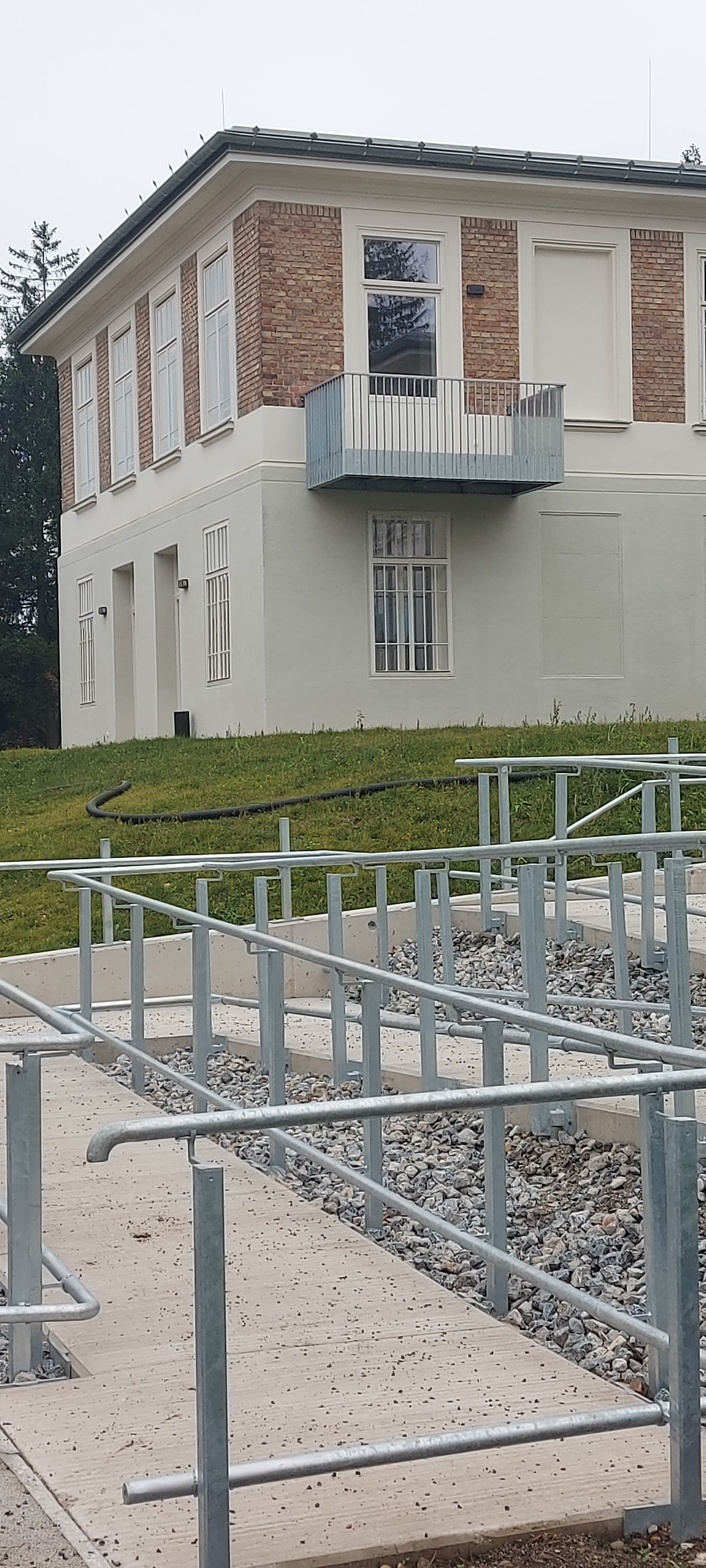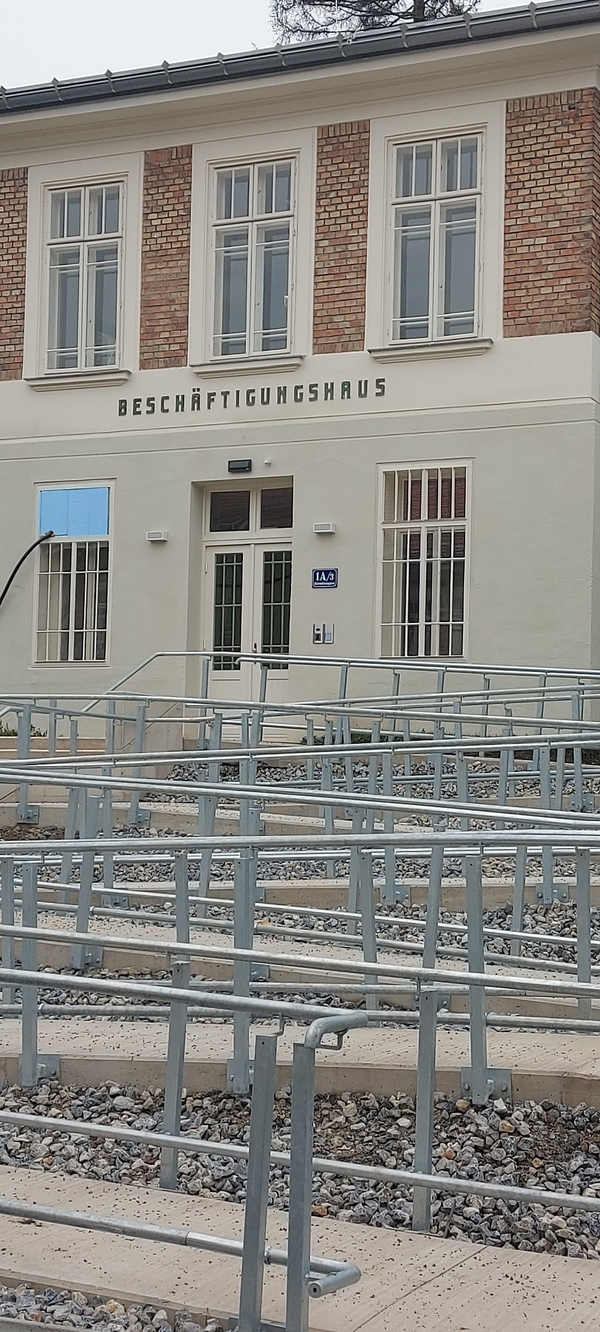 Die barrierefreie Rampenlandschaft vor dem "Beschäftigungshaus" wirkt in ihrer plumpen Monstrosität wie eine Leistungsschau des Verzinkungsgewerbes. Besonders auffällig wird das, wenn sie mit Bauten aus handwerklich glücklicheren Zeiten kollidiert. Zum Beispiel bei den Pavillons im Ostteil des Otto-Wagner-Areals.